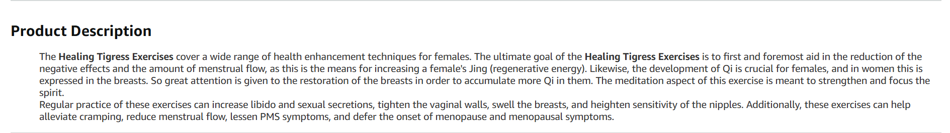 The Healing Tigress Exercises cover a wide range of health enhancement techniques for females.
